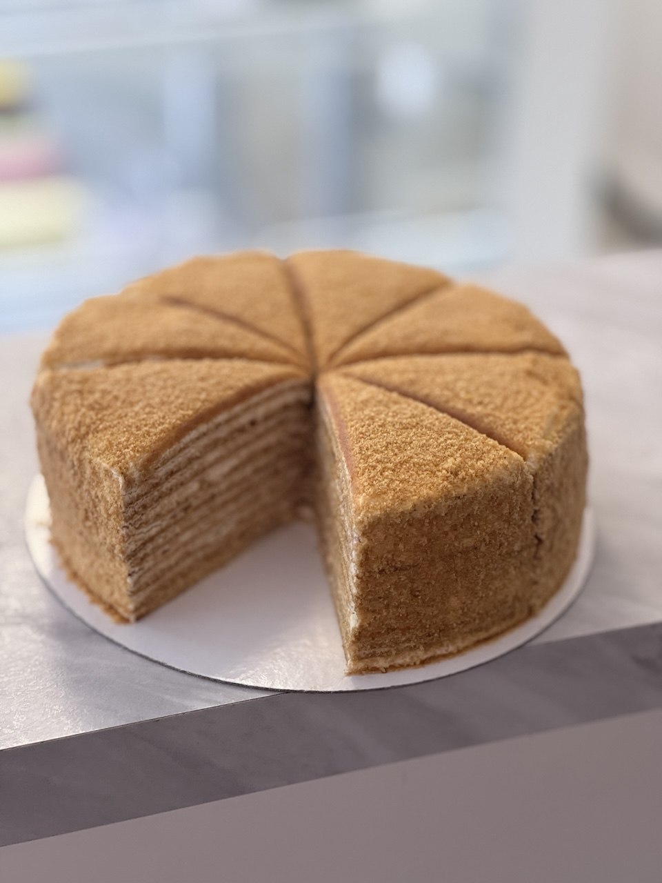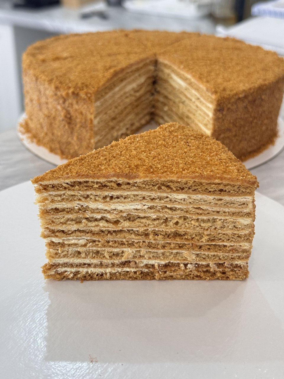Состав:сахар,белок яичный пастеризованный, желток яичный пастеризованный,сметана м.д.ж 20%,сливки м.д.ж. 33%,слив.масло м.д.ж.82,5%,мёд натуральный цветочный,сахарная пудра,соль пищевая,семена стручков ванили.Продукция производится на предприятии,где используются арахис,орехи,мёд. Пищевая и энергетическая ценность в 100г: Белки 5,8 г, жиры 14,2 г, углеводы 47,2 г, 290 ккал Условия хранения: Хранить при температуре от 2.0 °C до 6.0 °С. Срок годности: 5 суток