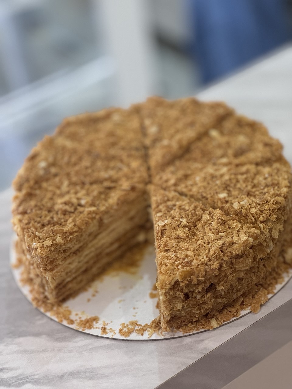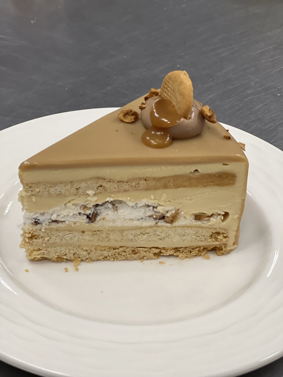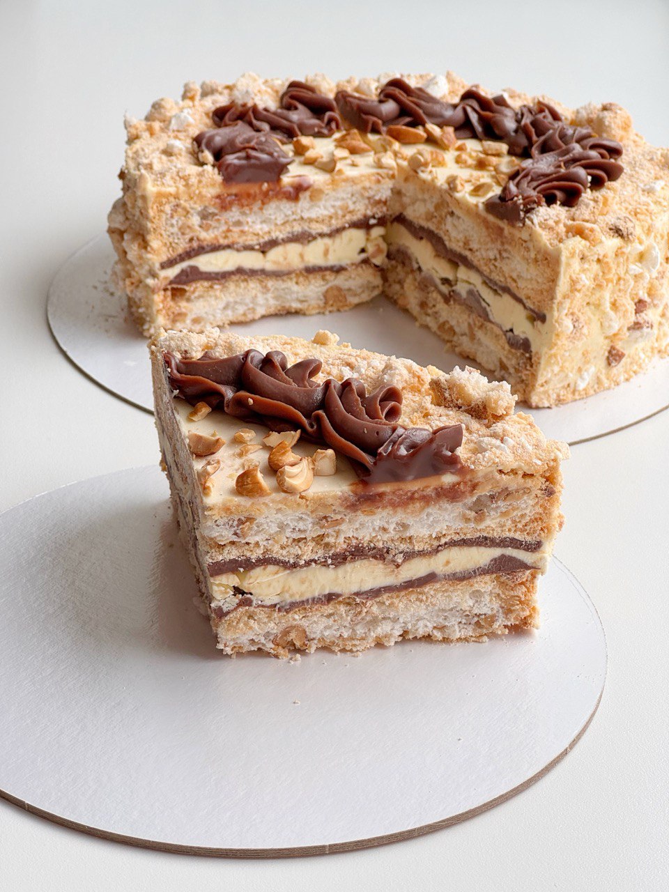 Карамелизированные грецкие орехи Карамель Крем карамельный Ванильные коржи с пропиткой Состав: яйца куриные пищевые, сахар, мука в/с, масло сливочное м.д.ж 82,5%,сливки натуральные м.д.ж. 33%,арахисовая паста,сахарная пудра,грецкий орех Продукция производится на предприятии, где используются аллергены: арахис, орехи, кунжут. КБЖУ на 100 : 400 ккал белки 6 жиры 28 углеводы 25 Срок годности 72 часа (начиная с утра в день доставки / самовывоза)