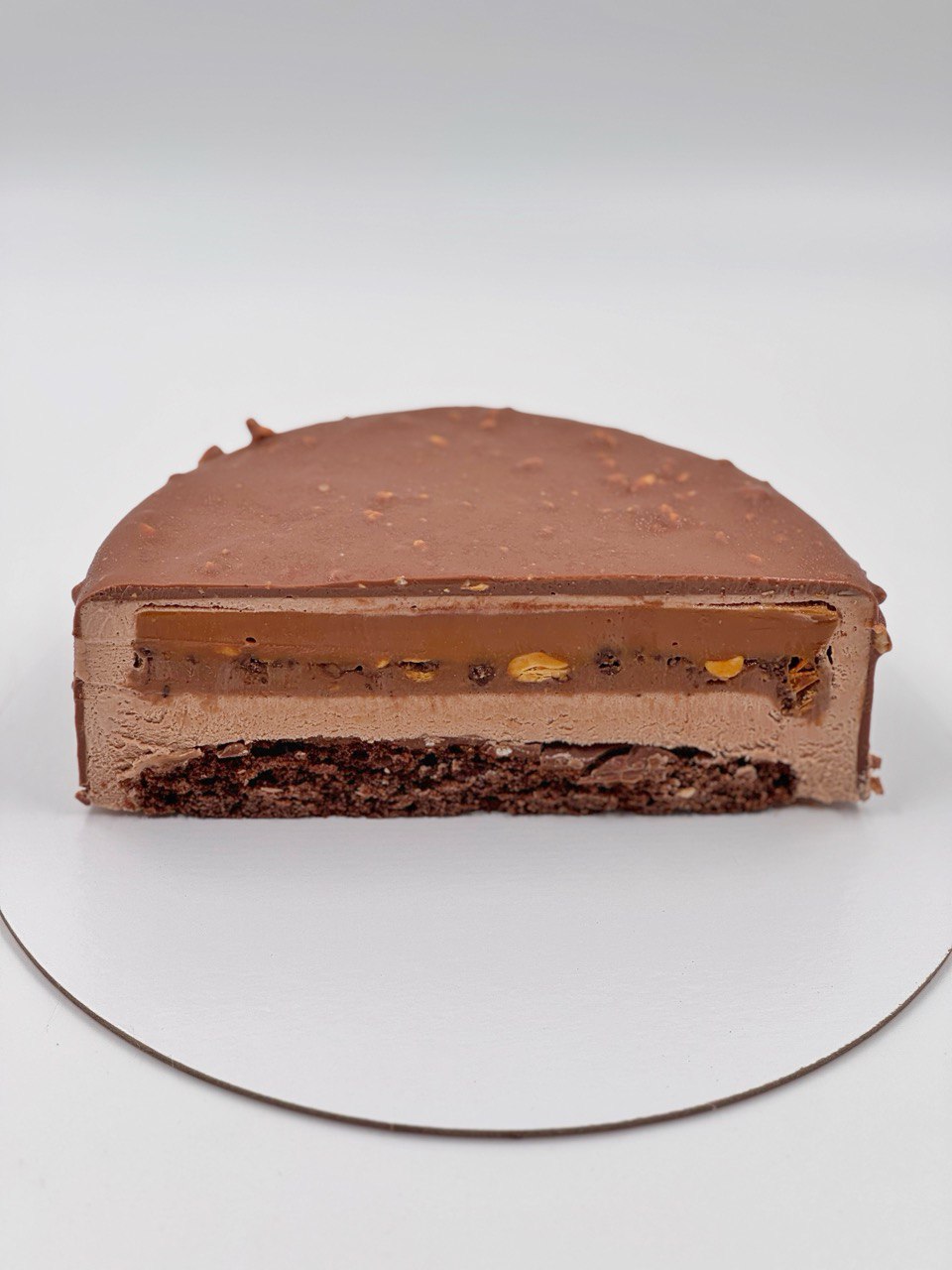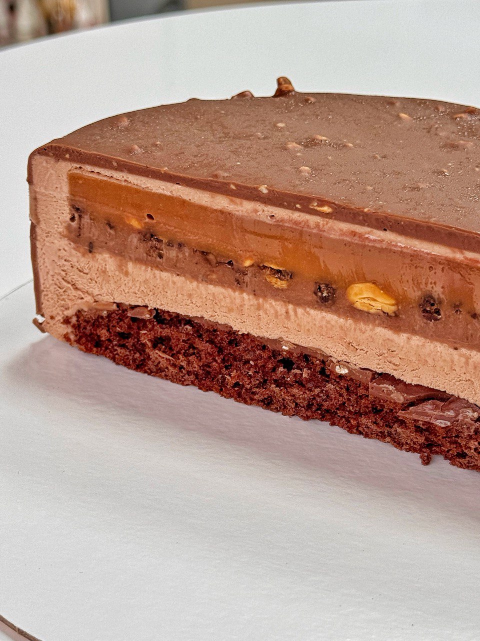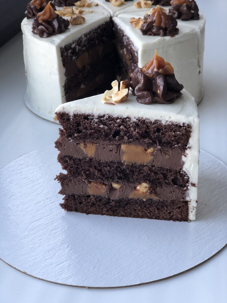 Шоколадные коржи,шоколадный кремчиз, ванильная пропитка, карамель, арахис Состав: сливки питьевые ультрапастеризованные м.д.ж в сухом веществе 72%, масло сливочное,ядра арахиса жаренные,яйцо куриное пищевое, пудра сахараная, какао-порошок, разрыхлитель,соль,мука пшеничная В/С, сахар Продукция производится на предприятии, где используются аллергены: орехи, арахис КБЖУ 382.2 на 100 г белки 4,3 жиры 21,5 углеводы 40 Срок годности 72 часа (начиная с утра в день доставки / самовывоза)
