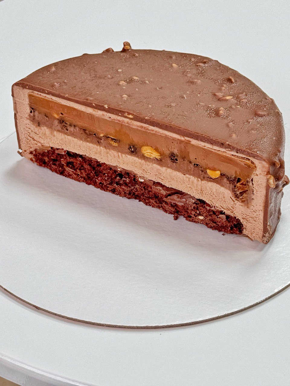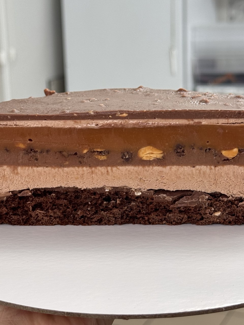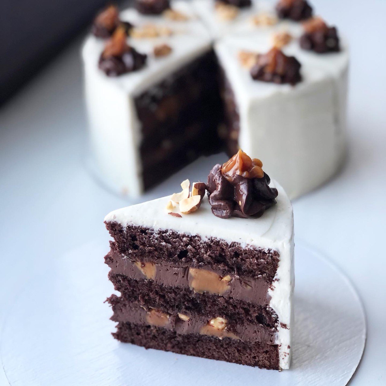 Шоколадные коржи,шоколадный кремчиз, ванильная пропитка, карамель, арахис Состав: сливки питьевые ультрапастеризованные м.д.ж в сухом веществе 72%, масло сливочное,ядра арахиса жаренные,яйцо куриное пищевое, пудра сахараная, какао-порошок, разрыхлитель,соль,мука пшеничная В/С, сахар Продукция производится на предприятии, где используются аллергены: орехи, арахис КБЖУ 382.2 на 100 г белки 4,3 жиры 21,5 углеводы 40 Срок годности 72 часа (начиная с утра в день доставки / самовывоза)