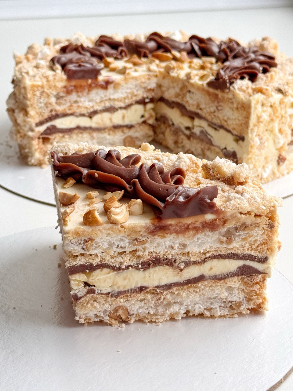 Хрустящая основа из безе с орешками Нежный, сливочный крем со сгущенкой Ганаш на молочном шоколаде Кешью жареный Состав: белок пастеризованный,сахар,кешью,мука В/С,сливочное масло м.д.ж.82,5%,сгущенное молоко м.д.ж.8,5%, шоколад молочный,сливки натуральные м.д.ж.33%,сироп глюкозы,натуральная ванильная паста. Продукция производится на предприятии, где используются арахис,орехи,мёд. КБЖУ на 100г: белки 23 г;жиры 24 г;углеводы 37.6 г; 463 ккал Условия хранения: хранить при температуре от 2.0 °С до 6.0 °С. Срок годности: 7 суток